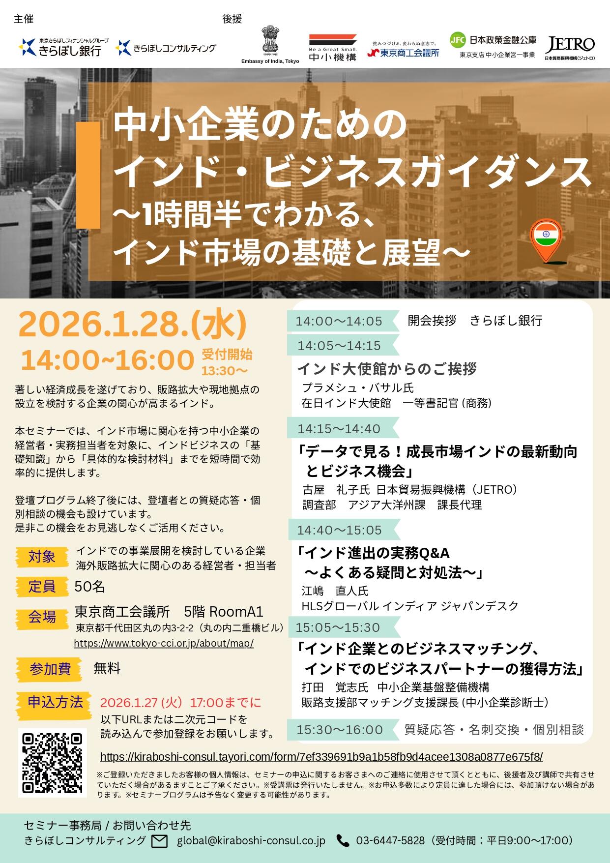 きらぼし銀行は1月28日、インド市場に関心を持つ中⼩企業の経営者・実務担当者を対象に「中⼩企業のためのインド・ビジネスガイダンス 〜1時間半でわかる、インド市場の基礎と展望〜」を開催する。詳細は以下の通り。