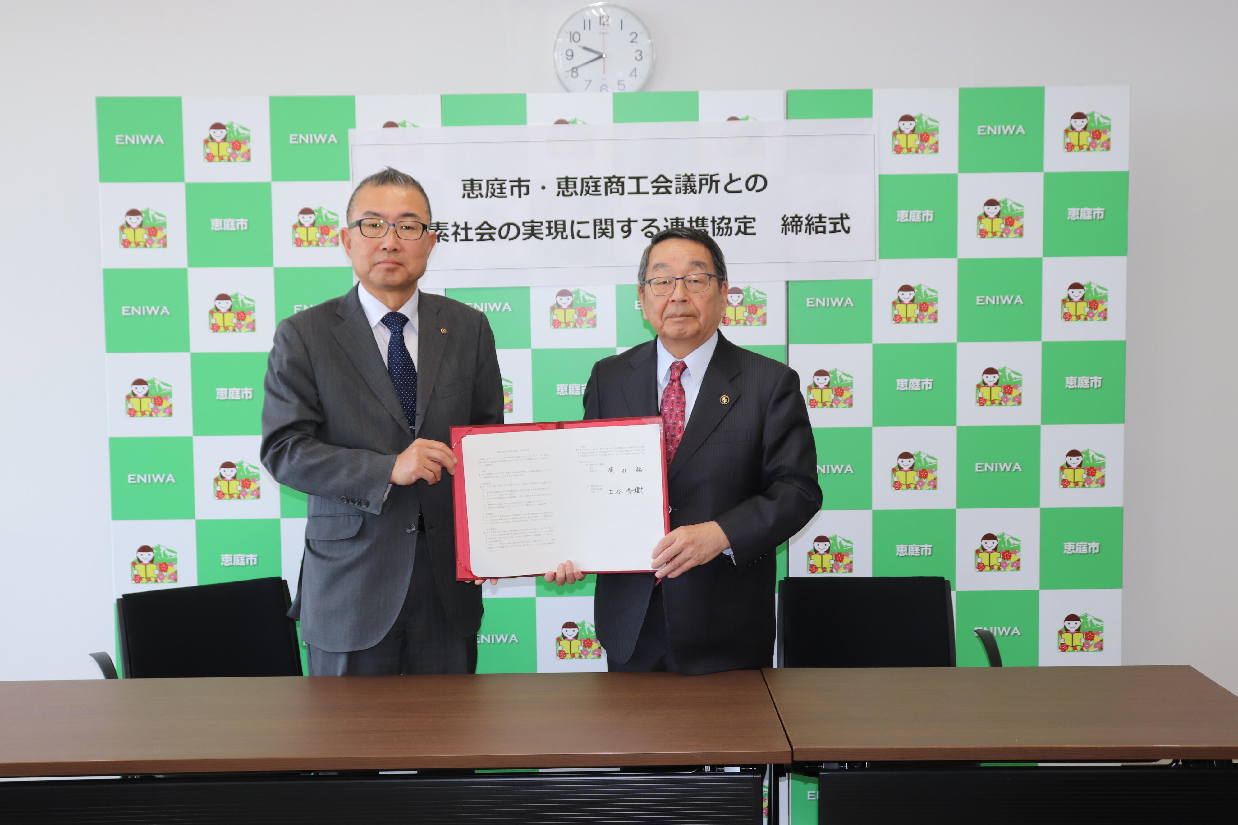 恵庭商工会議所(北海道、土谷秀樹会頭・サンガーデン)と恵庭市は4月23日、「脱炭素社会の実現に関する連携協定」を締結した。2022年に市が「ゼロカーボンシティ宣言」を行ったこと、また、同所が2023年に「2023~2025環境アクションプラン」を策定したことを受け、今回の協定では、両者がさらに市内の脱炭素化に向けた取り組みを連携強化することを目指す。具体的には「脱炭素社会実現に資する市内事業者への取り組みの推進および啓発」「省エネルギーの推進」「市内事業者における二酸化炭素排出量の削減」「廃棄物の発生抑制、再使用および再生利用の3Rの推進」「地域経済の発展に資するゼロカーボンシティの実現に向けた取り組み」の5つの項目について連携協力を行うことを確認した。