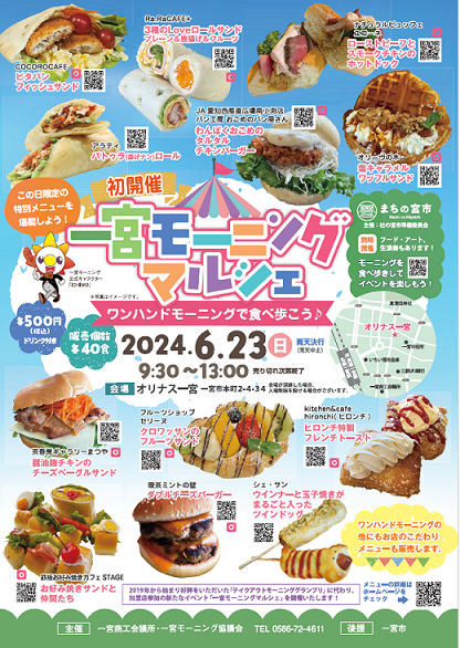 一宮商工会議所(愛知県、豊島半七会頭・豊島)・「一宮モーニング協議会」は6月23日、一宮市内の多目的施設・オリナス一宮で、グルメイベント「一宮モーニングマルシェ」を初開催する。市内の喫茶店で提供されるモーニングサービスを市の“食文化”として盛り立てる「一宮モーニングプロジェクト」の加盟店12店が参加。若者に人気の「ワンハンドグルメ」をテーマに、各店がこの日限定の特別メニューを販売する。また、当日はアート・クラフト、フードの販売や生演奏などが行われる商店街のイベント「まちの宮市」(主催:杜の宮市準備委員会)も同時開催。同所は、「モーニングを片手にまち歩きを楽しんでほしい」と来場を呼び掛けている。