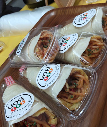 地元の銘菓・成金まんじゅうにチューリップの焼き印を押した「チューリップ成金」、赤い皮とあん、梅の香りが特徴の「梅あんぱん」など、これまでのフェアで好評だった商品を販売。さらに、ご当地グルメの焼きスパをトルティーヤで包んだ新商品「まきスパ」もお披露目し、ユニークなグルメで来場者を引きつけた。収益の一部は、来年のフェア開催の一助として寄付を行う。
