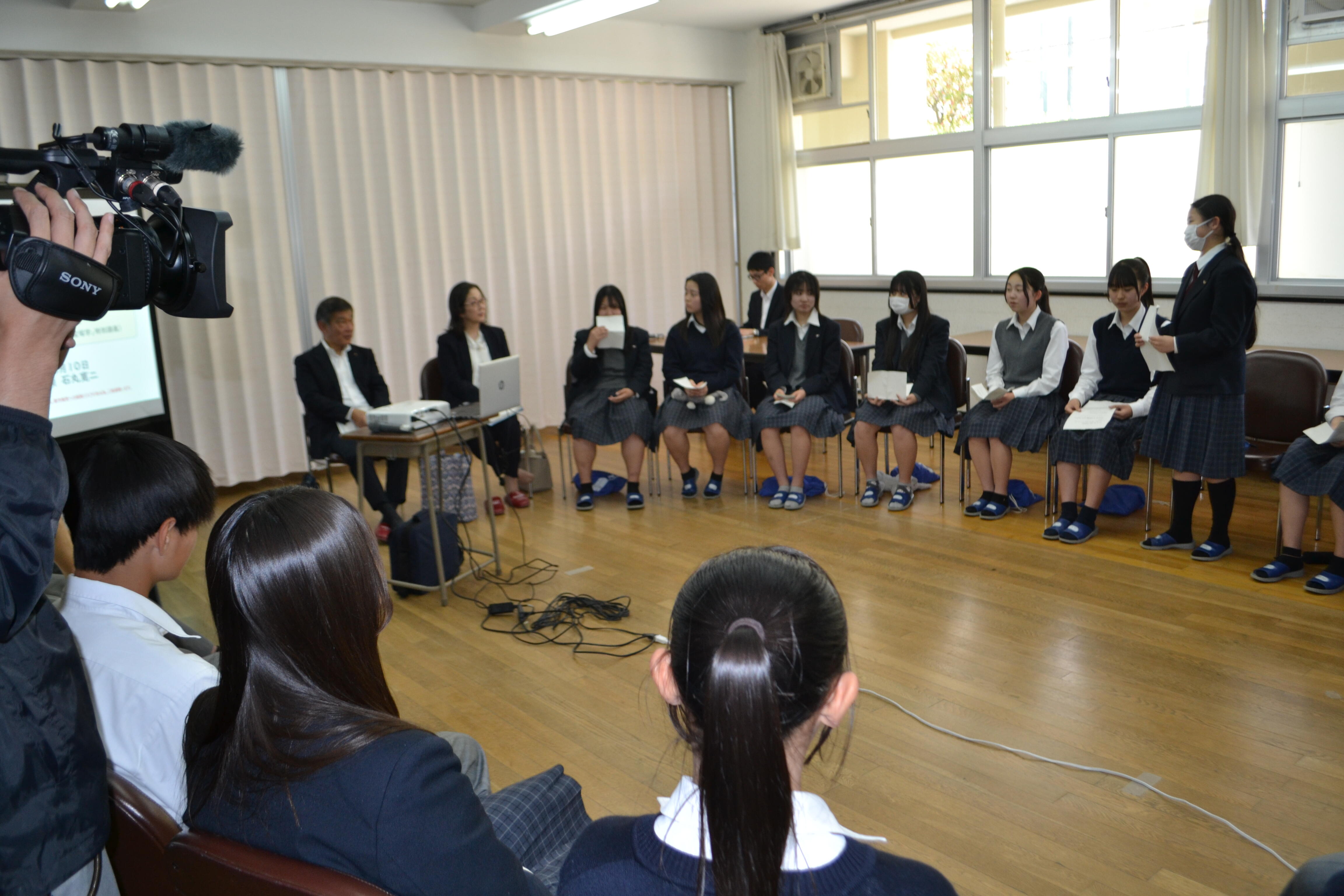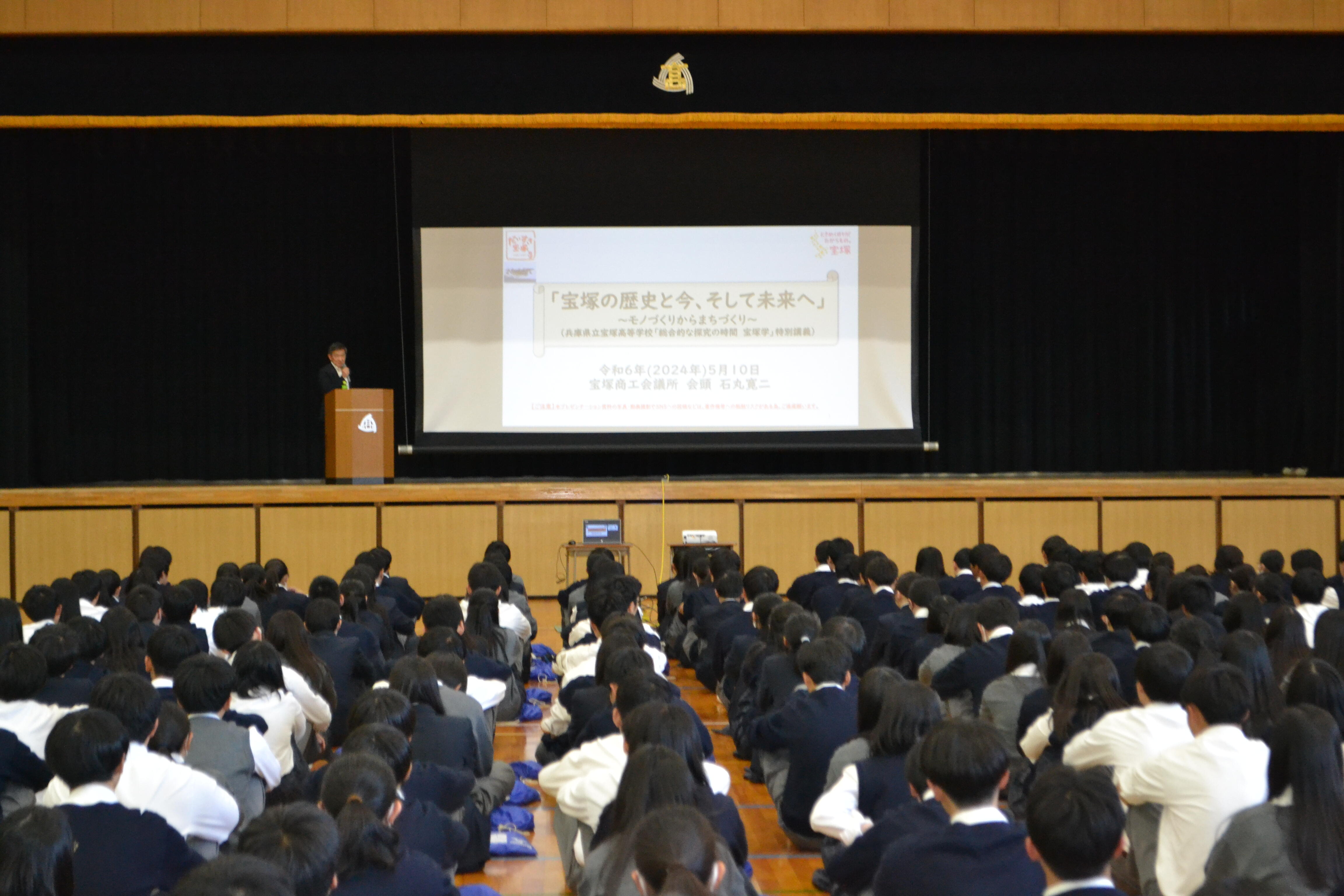 特別講義では、2年生(237人)に対してまちの魅力を伝えたのち、市の産業や自らが関わった救難飛行艇「US-2」の開発にも触れ、「市内の個性的な企業が、社会を豊かにするために夢を持ってモノづくりをしている」と強調。意見交換会では、石丸会頭と2年生ヒューマンサイエンス類型の生徒(23人)が車座になって、宝塚のまちの未来について活発な意見交換を行った。参加した生徒からは「芸術文化のまちとしての強みをSNSで発信することで市外からの観光客を増加させるべき」や「若者向けの娯楽施設の誘致がまちの魅力をさらに向上させる」など、まちの強みをより生かす方法や、弱みの改善策について積極的な発言があった。意見を聞いた石丸会頭は「社会課題を的確に捉えられている。社会や政治に興味を持って失敗を恐れずに行動してほしい」とコメント。生徒からは「自分が住んでいる地域以外も実際に自身の目で確かめ、どのようなことができるのかを考えていきたい」との感想が寄せられた。