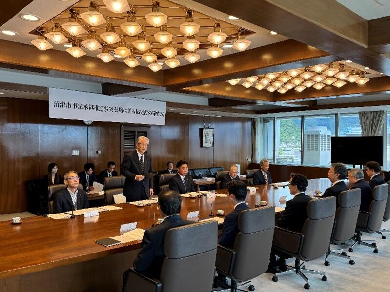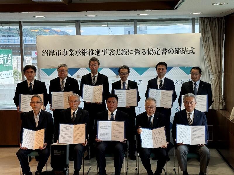 沼津商工会議所(静岡県、紅野正裕会頭・沼津信用金庫)、沼津市、静岡県中小企業団体中央会、静岡県事業承継・引継ぎ支援センター、静岡県よろず支援拠点、静岡県信用保証協会、株式会社商工組合中央金庫沼津支店、沼津信用金庫、株式会社日本政策金融公庫沼津支店、富士伊豆農業協同組合、沼津市商工会など11団体で組織する「ぬまづビジネスサポート連絡会」は6月19日、市内事業者の事業承継を円滑に進めるため「沼津市事業承継推進事業実施に係る協定」を締結した。同協定は市内で創業を希望する人や事業を拡大したいと考える人と、後継者不足に悩む事業者をつなぎ、地域経済活動の維持発展に寄与するもの。今後は各支援機関が独自に実施している支援ツールや支援制度などの情報を共有して総合的な支援を行う。