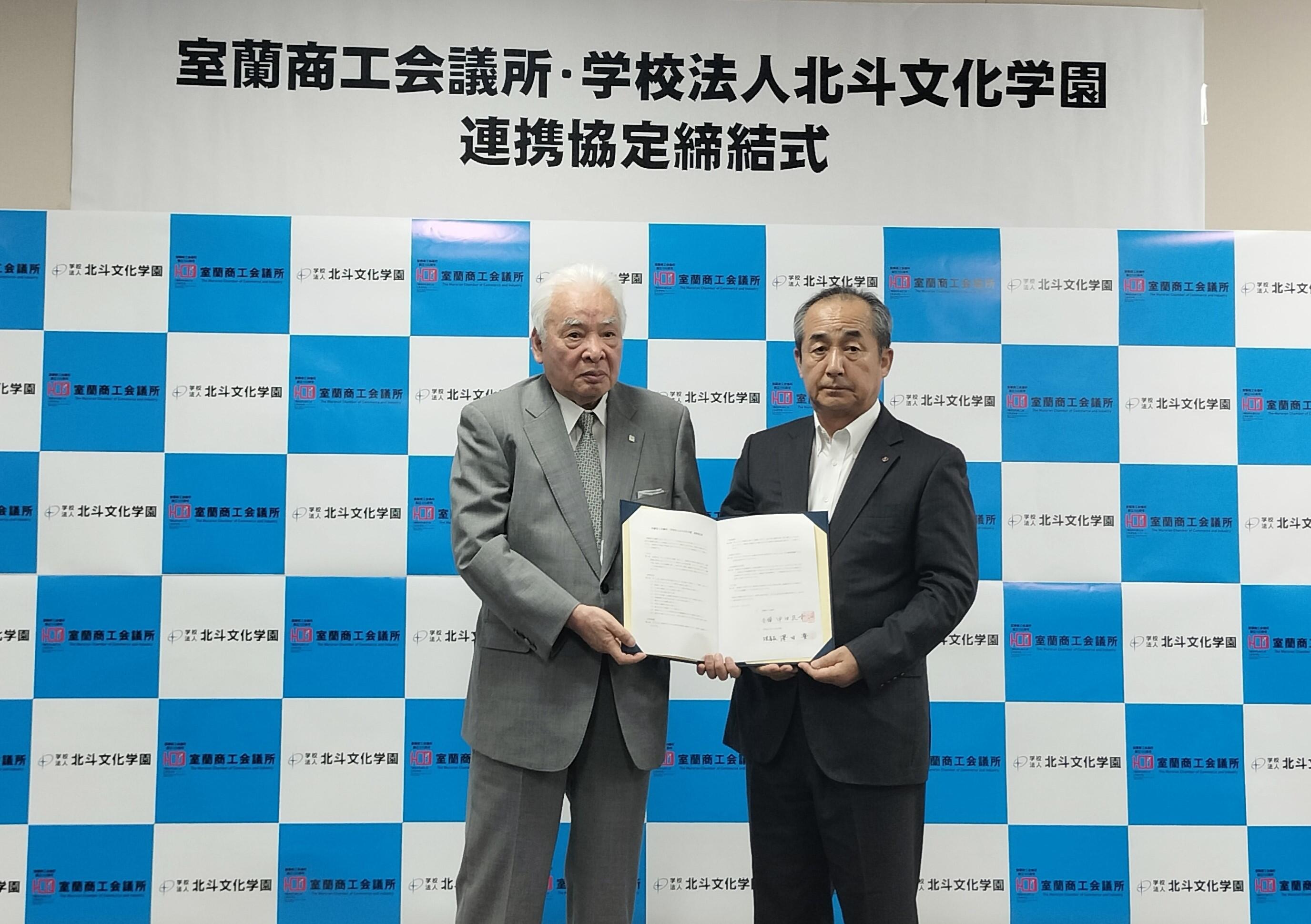 室蘭商工会議所(北海道、中田孔幸会頭・東海建設)は7月23日、室蘭市で北海道福祉教育専門学校やインターナショナル調理技術専門学校を運営する学校法人北斗文化学園と連携協定を締結した。同協定の締結により、両者は地域課題の解決に向け、地域一体で推進するキャリア教育、企業の成長を担う人材育成、学生の地域への就職促進、外国人労働者の活用、多文化共生の地域づくりなどに関して連携を図りながら協働し地域の発展を目指す。
