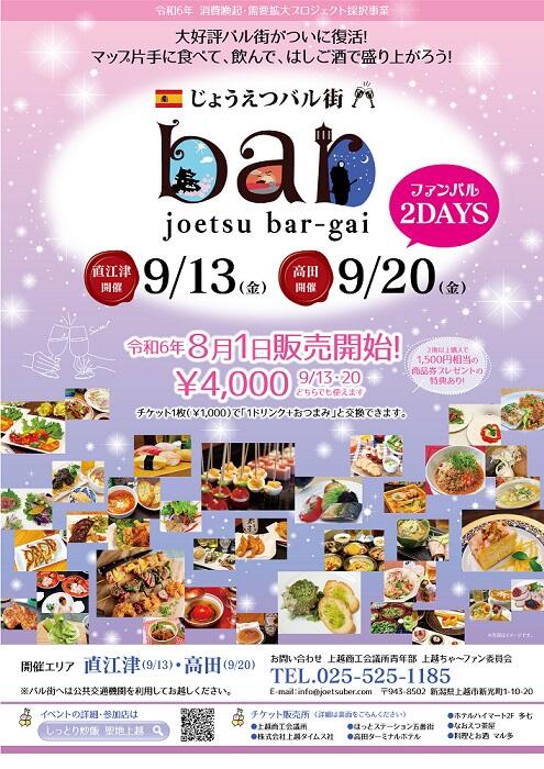 上越商工会議所(新潟県、髙橋信雄会頭・高助コーポレーション)青年部(上越YEG)「上越ちゃ~ファン委員会」は9月13日に上越市内の直江津エリア、20日に高田エリアで、「じょうえつバル街」を開催する。同イベントは、チケット1枚で1ドリンクとおつまみ(ピンチョス)に交換できるチケット(1冊4枚綴り4000円)を購入し、参加店が記載されたマップを手に好きな店をはしごして店自慢の料理と飲み物を楽しむ人気イベント。3年ぶりの開催となった今回は、直江津エリア17店舗、高田エリア29店舗が参加している。当日は、各エリアでお酒やお茶、炒飯の振る舞いを行う乾杯イベントも開催。同YEGは、この機会にまだ行ったことのない新しいお店を開拓してほしいとアピールしている。チケットは2冊以上購入すると1500円分の商品券をプレゼント。当日使い切れなかったチケットもバル開催後1週間利用できる。チケットは同所、上越タイムス社、ほっとステーション五番街(レンタルスペース)などで販売中。
