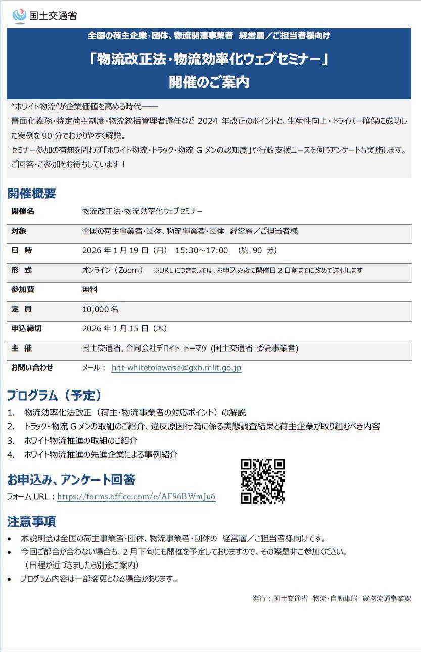 国土交通省は1月19日、全国の荷主事業者や物流事業者などを対象に「物流改正法・物流効率化ウェブセミナー」を開催する。同セミナーは、深刻化するドライバー不足への対応や物流業界の生産性向上、働きやすい労働環境づくりのため同省が主導する「ホワイト物流」推進運動の一環。2024年に改正された物流効率化法(25年4月1日施行)の改正ポイント(書面化義務・特定荷主制度・物流統括管理者選任など)を解説するとともに生産性向上・ドライバー確保に成功した企業の実例を紹介する。参加費は無料。申込期限は1月15日。