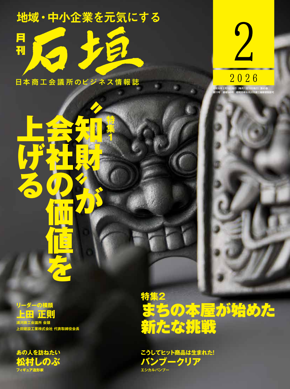 日本商工会議所のビジネス情報誌「月刊石垣」の最新号(2026年2月号(2月10日発行)、605円)の「あの人を訪ねたい」は、フィギュア造形家の松村しのぶさん。生き物フィギュアの第一人者として知られ、空前の食玩ブームを巻き起こした「チョコエッグ」の誕生秘話や、フィギュア制作への思いを語る。「特集1」は「“知財”が会社の価値を上げる」と題し、日本商工会議所知的財産専門委員会委員長の宗像直子さんによる解説のほか、鈴木又五郎商店(湯沢市)、中日本カプセル(大垣市)、音羽電機工業(尼崎市)を紹介する。「特集2」では、「まちの本屋が始めた新たな挑戦」をテーマに、マルサン書店(沼津市)、元野木書店(飯塚市)の取り組みを取り上げる。「こうしてヒット商品は生まれた!」にはエシカルバンブー(防府市)の「バンブークリア」、「リーダーの横顔」には浦河商工会議所の上田正則会頭が登場する。