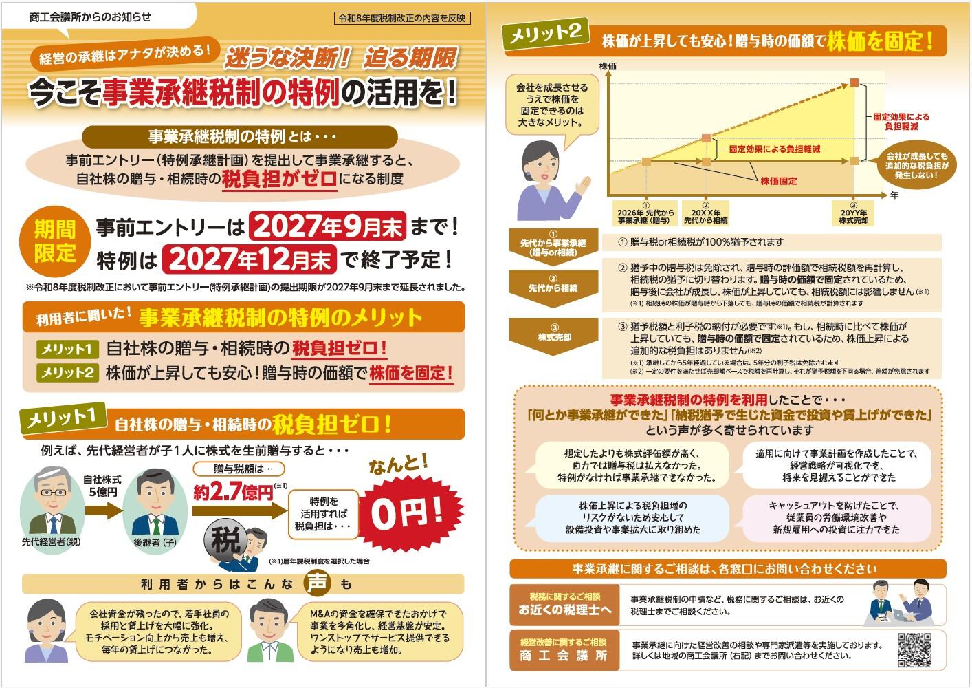 当所では「法人版事業承継税制」の周知チラシ「経営の承継はアナタが決める!今こそ事業承継税制特例の活用を!」を作成いたしました。