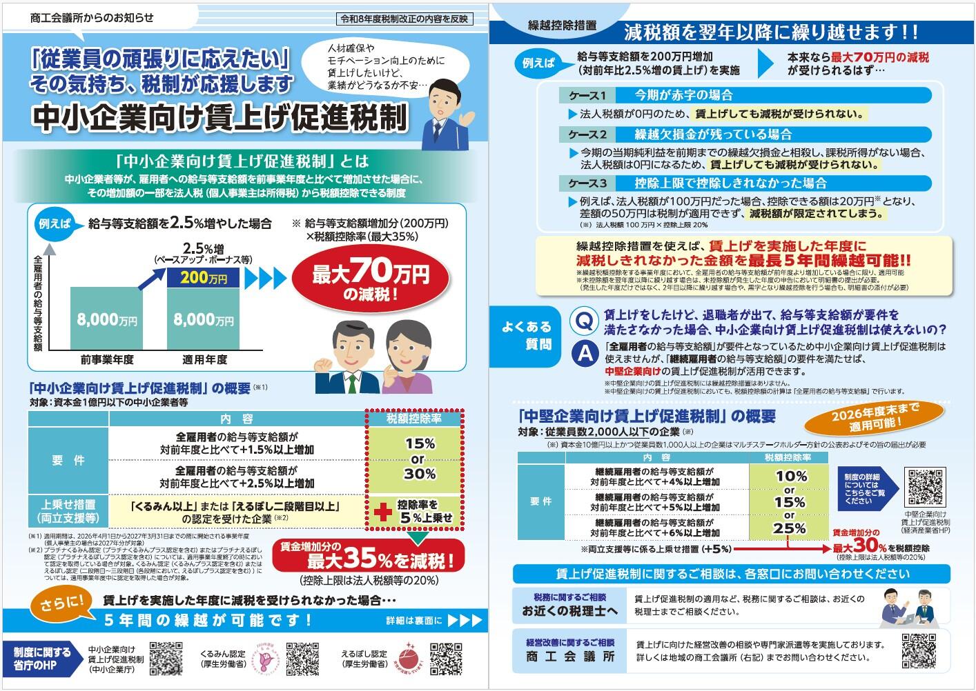 当所では「中小企業向け賃上げ促進税制」の周知チラシ(「従業員の頑張りに応えたい」その気持ち、税制が応援します)を作成いたしました。