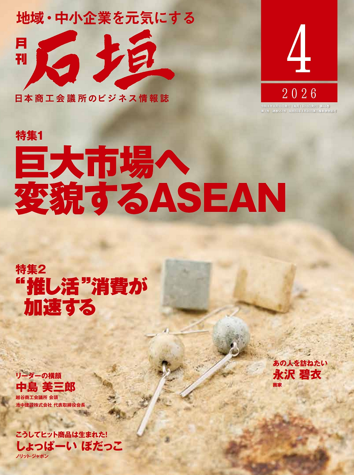 日本商工会議所のビジネス情報誌「月刊石垣」の最新号(2026年4月号(4月10日発行)、605円)の「あの人を訪ねたい」は、秋田県を拠点に活動する画家の永沢碧衣さん 。狩猟免許を取得しマタギ文化に深く関わりながら、人や動植物との出会いを通じて、自然と人間の関係性を問うダイナミックな作品をつくり続けている 。「特集1」は「巨大市場へ変貌するASEAN」と題し 、ベアレン醸造所(盛岡市) 、マイコック産業(白山市) 、梅の花グループ(久留米市)を紹介する 。「特集2」では、「“推し活”消費が加速する」をテーマに、ニッセイ基礎研究所生活研究部研究員の廣瀬涼さんが解説する 。「こうしてヒット商品は生まれた!」にはノリット・ジャポン(秋田市)の「しょっぱーい ぼだっこ」 、「リーダーの横顔」には越谷商工会議所の中島美三郎会頭が登場する 。